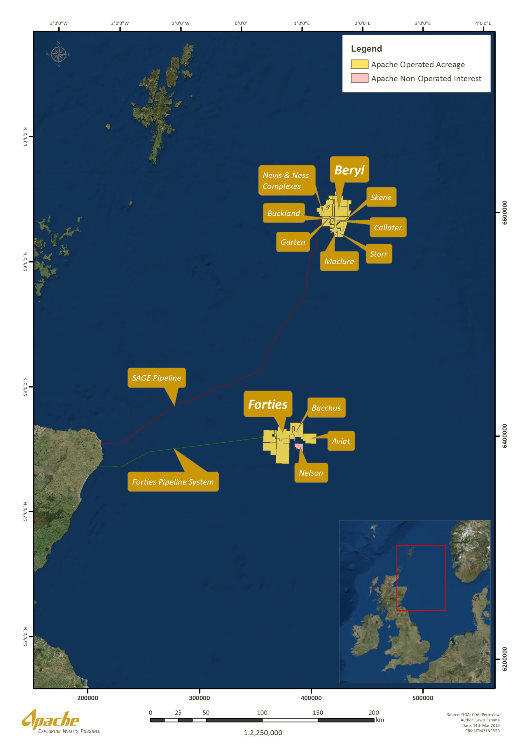 The Beryl Field and associated infrastructure (Alpha and Bravo platforms and facilities), and the nearby associated Ness, Nevis, Buckland and Skene Fields, are located 335 kilometers northeast of Aberdeen.